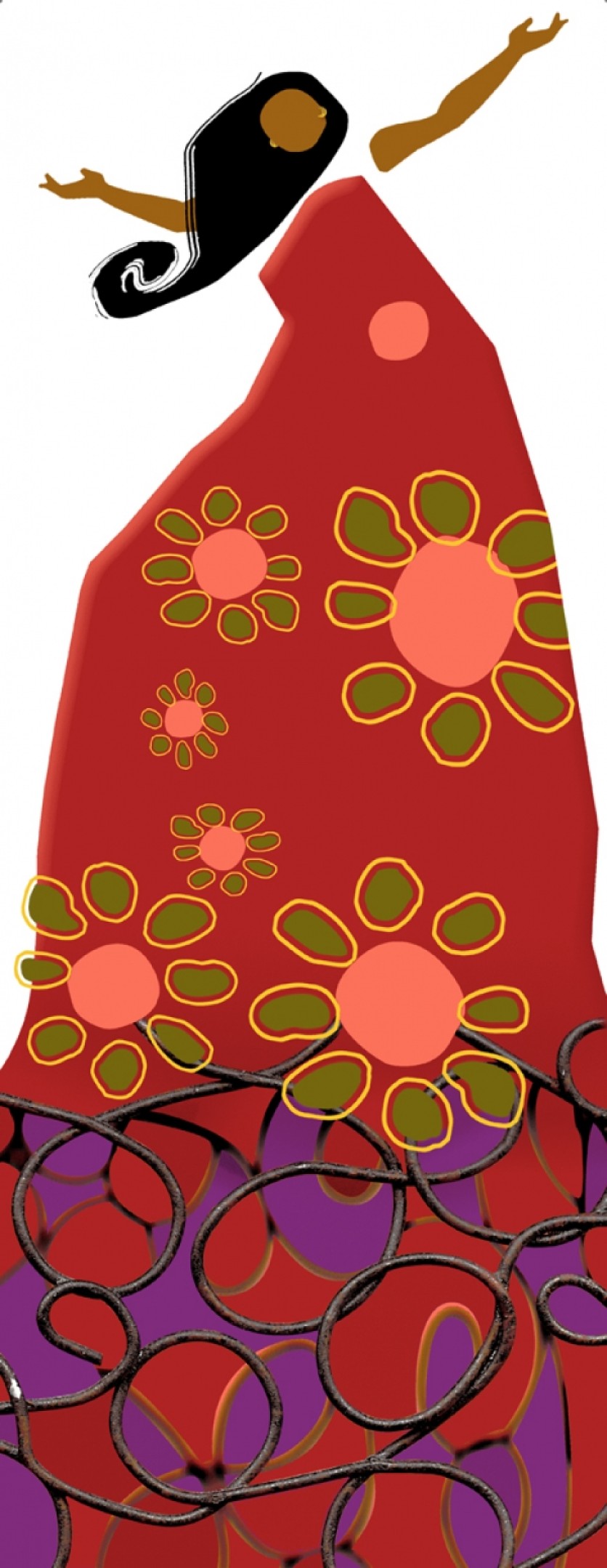 Es la imagen de una bella mujer gitana bailando con los brazos en alto, se muestra ante todos con ese gesto que quiere compartir su gran alegría, que es tan positiva como la luz del sol. Tiene tanto arte y gracia bailando que hasta el estampado (flores) de su vestido colorao parece que se arremolina y cobra vida (se sale del vestido).